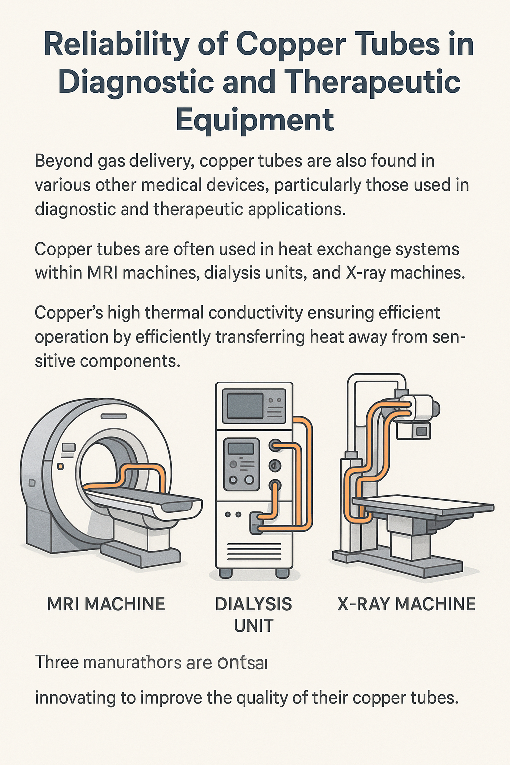 Higit pa sa paghahatid ng gas, ang mga tubo ng tanso ay matatagpuan din sa iba't ibang iba pang mga medikal na aparato, lalo na ang mga ginamit sa Diagnostic at therapeutic application . Halimbawa, ang mga tubo ng tanso ay madalas na ginagamit sa mga sistema ng palitan ng init Sa loob ng mga medikal na kagamitan tulad ng MRI machine, mga yunit ng dialysis, at mga x-ray machine. Ang mataas na thermal conductivity ng tanso ay nagsisiguro na ang mga makina na ito ay gumana nang mahusay at ligtas sa pamamagitan ng mahusay na paglilipat ng init na malayo sa mga sensitibong sangkap.