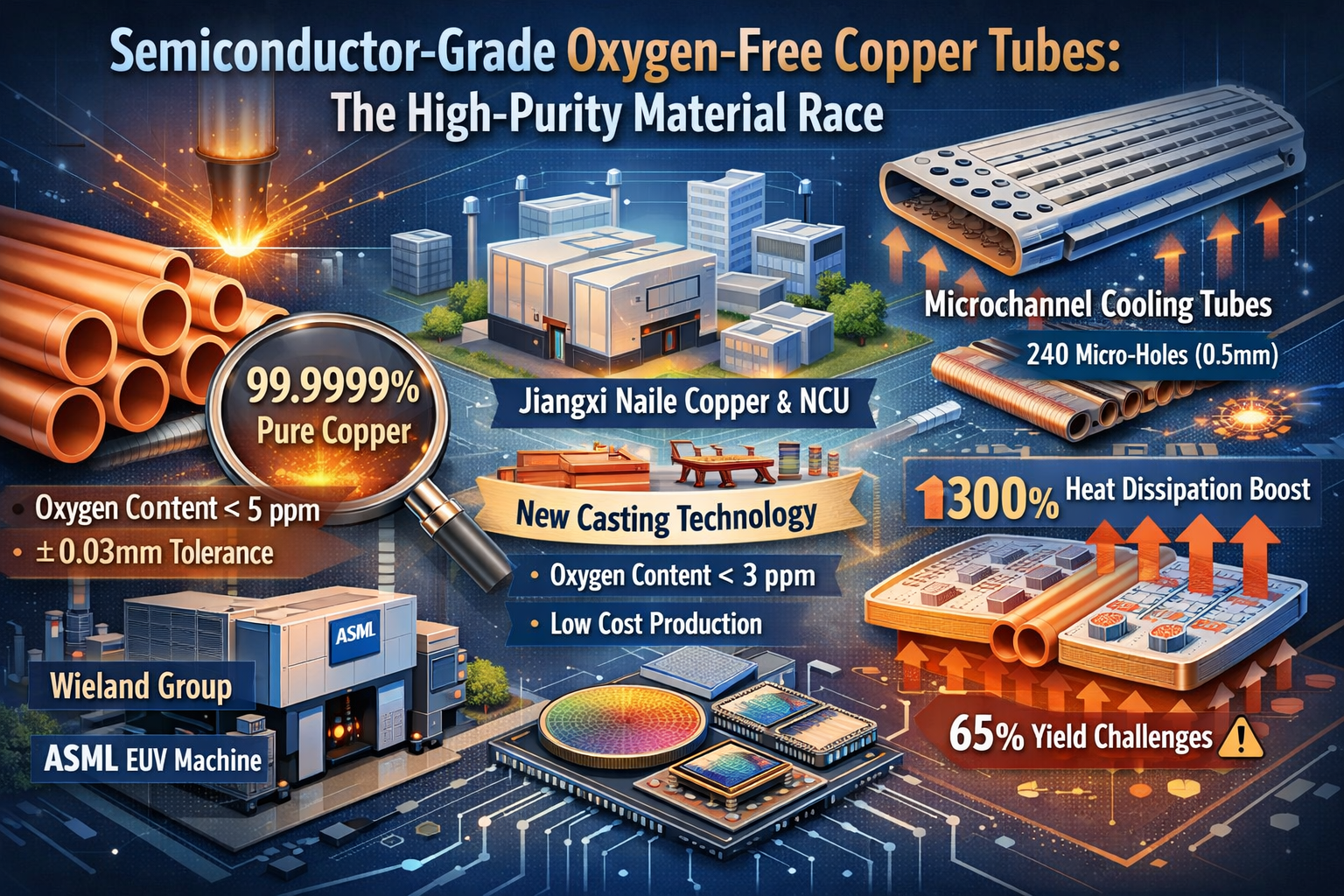 Mga tagumpay sa cost-effective umuusbong ang mga alternatibo. Ang Jiangxi Naile Copper, sa pakikipagtulungan sa Nanchang University, ay bumuo ng isang "ultra-low oxygen split horizontal continuous casting method" na kumokontrol sa nilalaman ng oxygen sa ibaba 3ppm sa isang-ikawalo ng halaga ng mga na-import na pamamaraan ng vacuum. Ang inobasyong ito ay pumasok sa supply chain para sa 14nm production lines ng SMIC. Kasama sa mga mas advanced na application ang mga wafer-level cooling tubes na may mga disenyo ng microchannel (hal., 240 micro-hole na 0.5mm diameter) upang mapahusay ang kahusayan sa pag-alis ng init ng 300%, kahit na ang mga rate ng ani ay nananatiling isang hamon sa 65%.