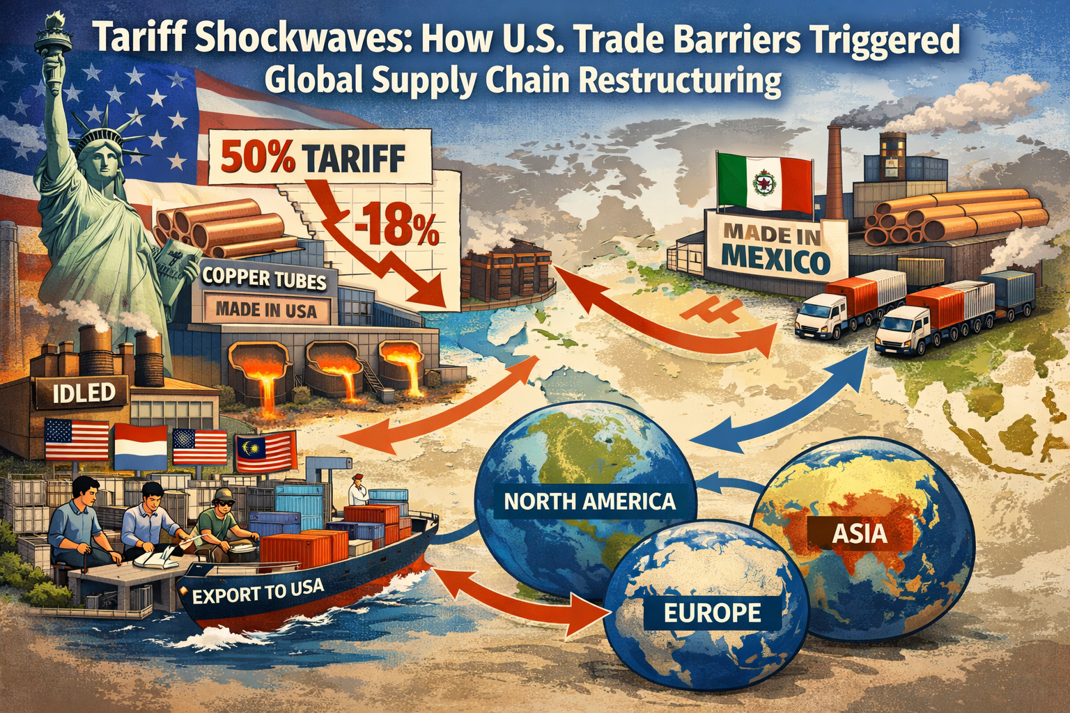 Subtitle: Nang magpataw ang U.S. ng 50% na mga taripa sa mga mga tubong tanso ay nag-trigger ng isang pandaigdigang trade chain restructuring, paano tumaas ang kapasidad ng produksyon sa Southeast Asya at Mexico ng 46.3% sa loob ng isang taon? Ang paglipat ng supply chain na ito na hinihimok ng patakaran ay muling iginuhit ang mapa ng pandaigdigang pamamahagi ng halaga para sa mga copper tube.