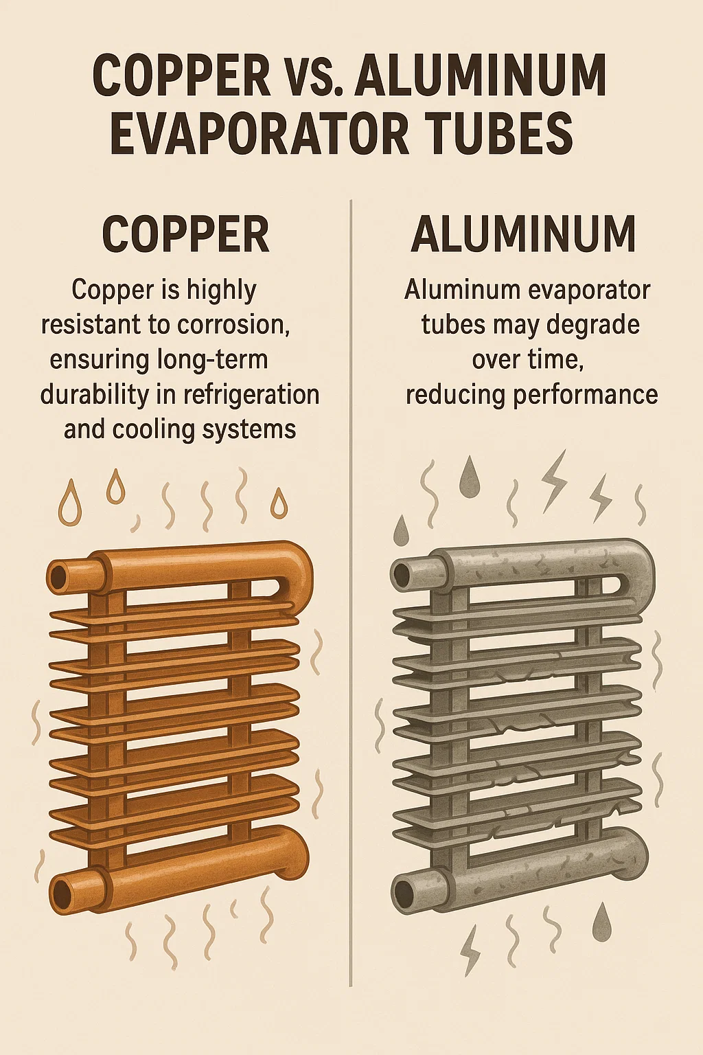 Aluminyo , habang ang isang mahusay na conductor ng init, ay may thermal conductivity ng halos 235 w/mk - tungkol sa 40% mas mababa kaysa sa tanso. Ang mas mababang thermal conductivity ay nangangahulugang ang mga tubo ng evaporator ng aluminyo ay mas matagal upang ilipat ang init, na potensyal na mabawasan ang pangkalahatang kahusayan sa paglamig.