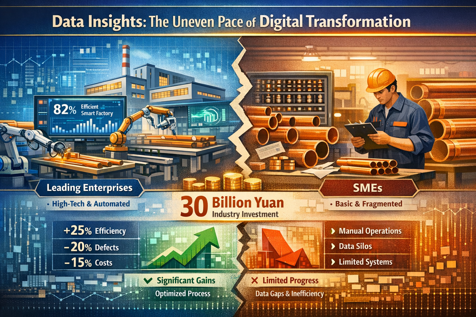 "Naggastos kami ng mahigit 8 milyong yuan sa isang ERP system at isang produksyon monitoring platform, ngunit sa huli, inilipat lang namin ang aming mga paper-based ledger online. Hindi gaanong bumuti ang kahusayan sa produksyon, at pinalaki pa nito ang workload para sa aming mga empleyado." Mr. Wang, ang pinuno ng isang medium-sized tubo ng tanso kumpanya sa Henan Province, ay nagpahayag ng karaniwang problemang kinakaharap ng industriya sa digital na pagbabago nito. Hinimok ng inisyatiba na "Made in China 2025" at ng Industry 4.0 wave, ang industriya ng copper tube ay nakakita ng pagsulong sa mga pagsusumikap sa digital na pagbabago, na may mga kumpanyang mula sa nangungunang mga negosyo hanggang sa maliliit at katamtamang laki ng mga tagagawa na namumuhunan nang malaki sa intelligent na kagamitan at mga digital system. Gayunpaman, ang katotohanan ay ang karamihan sa mga kumpanya ay nakulong sa isang cycle ng "mabigat na pamumuhunan, maliit na kita," na may digitalization nananatiling mababaw; iilan lamang sa mga kumpanya ang nakamit ang malalim na empowerment, na gumagamit ng digitalization upang ikonekta ang buong chain ng produksyon, kadena ng suplay, at serbisyo sa customer, na nagreresulta sa pagbawas sa gastos at pagpapabuti ng kahusayan. Sa isang bata, nariyan ang pormalismo ng "digitalization for the sake of digitalization," at sa kabilang bata, nariyan ang mabisang pagbabago ng "driving value creation through digitalization." Bakit may ganitong polariseysyon sa digital transformation ng industriya ng copper tube? Sa likod nito ay mayroong isang kumplikadong interplay ng mga cognitive bias, teknolohikal na adaptasyon, suporta sa talento, at estratehikong pagpaplano, na may kinalaman din sa pangunahing puwersang nagtutulak para sa mataas na kalidad na pag-unlad ng industriya.