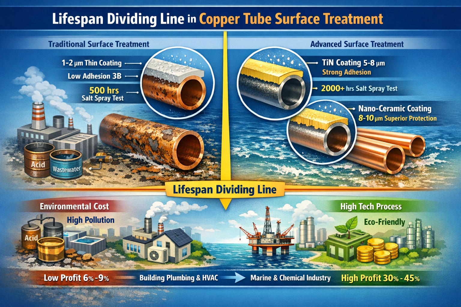 “Pareho naman mga tubong tanso ginamit sa kagamitan sa desalination ng tubig-dagat , ngunit ang mga produktong ginamit namin sa paggamot maginoo na pag-aatsara at kawalang-sigla nagpakita ng pitting corrosion at leakage sa mas mababa sa 3 taon sa marine environment; habang ang produkto ng kakumpitensya, ginagamot sa teknolohiya ng vacuum ion plating , ay may buhay ng serbisyo na mahigit 15 taon, at ang presyo ng unit nito ay 30% na mas mataas kaysa sa amin.” Si G. Liu, ang teknikal na direktor ng isang kumpanya ng copper alloy tube sa Qingdao, ay nagtataglay ng dalawang seksyon ng mga itinapon at buo na mga tubo ng tanso, na inilalantad ang nakatagong halaga ng teknolohiya sa paggamot sa ibabaw. Ang pang-ibabaw na paggamot, bilang ang huling hakbang sa paggawa ng copper tube, ay maaaring magmukhang isang simpleng pantulong na operasyon ng "pag-alis ng kalawang at patong," ngunit direktang tinutukoy nito ang produkto paglaban sa kaagnasan, paglaban sa pagsusuot , at buhay ng serbisyo , at further impacts its market positioning and added value. Currently, most domestic copper tube manufacturers still rely on traditional surface treatment processes such as pag-aatsara at ordinaryong kawalang-sigla , na ginagawang hindi angkop ang kanilang mga produkto para sa mga demating na kapaligiran tulad ng marine, kemikal, at high-end na paggamot sa tubig ; ilang kumpanya, gayunpaman, ay nag-upgrade ng kanilang pinong mga teknolohiya sa paggamot sa ibabaw , na nagpapahintulot sa kanilang mga copper tube na mapanatili ang matatag na pagganap sa matinding kapaligiran at madaling makuha ang high-end na merkado. Ang payat nito" proteksiyon na pelikula " ay nagiging pangunahing detalye na nagpapaiba sa pagiging mapagkumpitensya ng mga produktong copper tube, at hawak din nito ang susi sa pag-upgrade ng industriya mula sa "kwalipikado" hanggang sa "mataas na kalidad."
