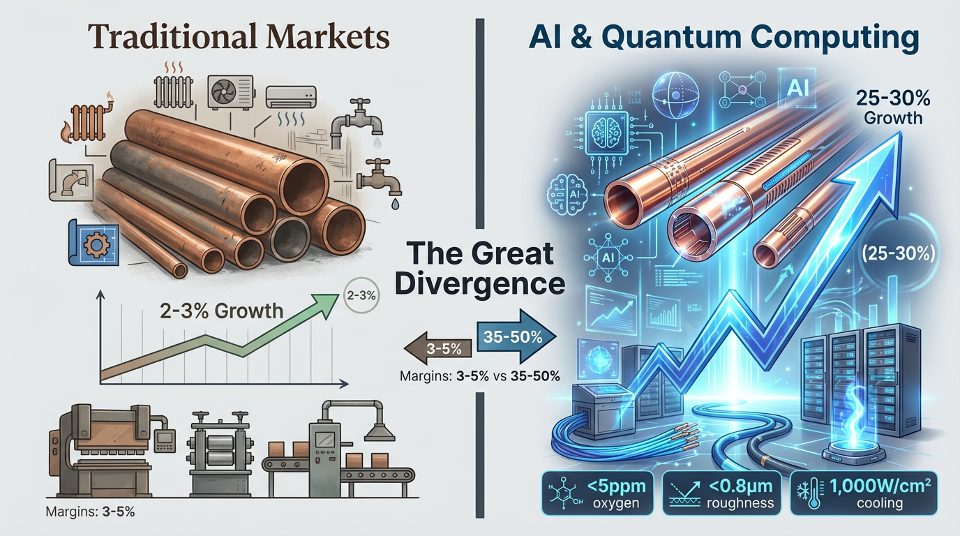 Ang global copper tube ang industriya ay nakakaranas ng hindi pa nagagawang pagkapira-piraso. Habang tradisyonal na konstruksyon and Mga aplikasyon ng HVAC lumalaki sa isang katamtamang 2-3% taun-taon, demand para sa mga tubo ng katumpakan sa pagmamanupaktura ng semiconductor, imprastraktura ng AI, at quantum computing ay tumataas sa 25-30% taun-taon. Lumilikha ang divergence na ito ng dalawang-tier na merkado: ang mga bulk producer ay nakikipagpunyagi sa 3-5% na mga margin, habang ang mga dalubhasang manufacturer ay nag-uutos ng mga gross margin na 35-50% para sa mga tubo na nakakatugon sa matinding mga detalye.