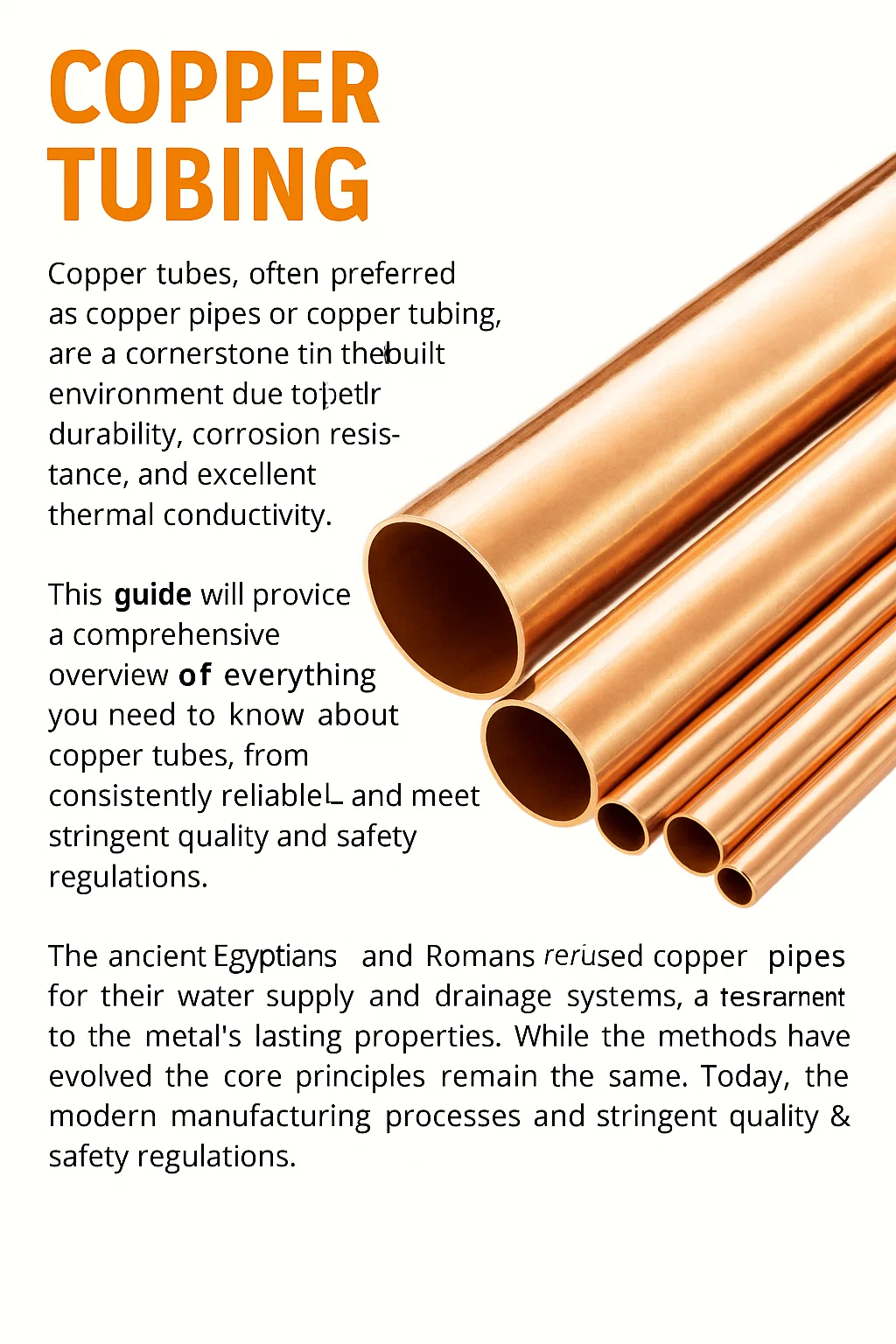 Ang paggamit ng tanso para sa pagdadala ng mga petsa ng tubig pabalik ng libu -libong taon. Ang mga sinaunang taga -Egypt at Romano ay gumagamit ng mga tubo ng tanso para sa kanilang mga suplay ng tubig at mga sistema ng kanal, isang testamento sa mga pangmatagalang katangian ng metal. Habang ang mga pamamaraan ay nagbago, ang mga pangunahing prinsipyo ay nananatiling pareho. Ngayon, ang mga modernong proseso ng pagmamanupaktura at mga pamantayang kasanayan ay nagsisiguro na ang mga tubo ng tanso ay patuloy na maaasahan at nakakatugon sa mahigpit na mga regulasyon sa kalidad at kaligtasan, na ginagawa silang isang mahalagang sangkap ng nakapaloob na kapaligiran.
